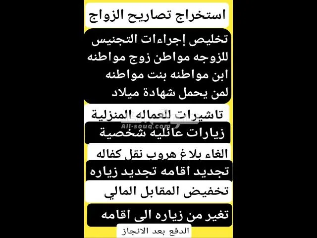 السلام عليكم ورحمة الله وبركاته..استقبل الان خدمات (التاشيرات) ١ تاشيرة زياره شخصيه ٢تاشيرة زيارة اعمال ✓ ٣تاشيرة زياره عائليه ٤ تاشيرات مهنيه ????️ استقبل الان خدمات (موافقة زواج) استخراج تصريح زواج مواطن من اجنبيه استخراج تصريح زواج سعودي من اجنبية أستخراج تصريح زواج مواطن من مقيمة استخراج تصريح زواج سعودي من مقيمة استخراج تصريح زواج مواطنه من اجنبي استخرا...