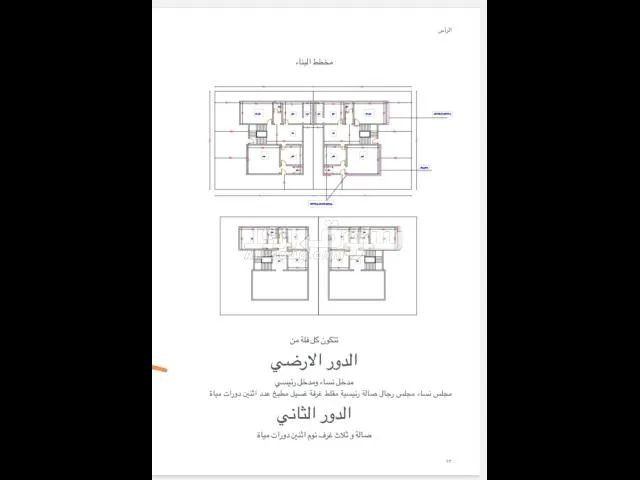 الدور الاول... مدخل نساء منفصل ومدخل رجال رئيسي مجلسين وصاله ومقلط وغرفة غسيل ومطبخ وعدد دوتين مياة .
