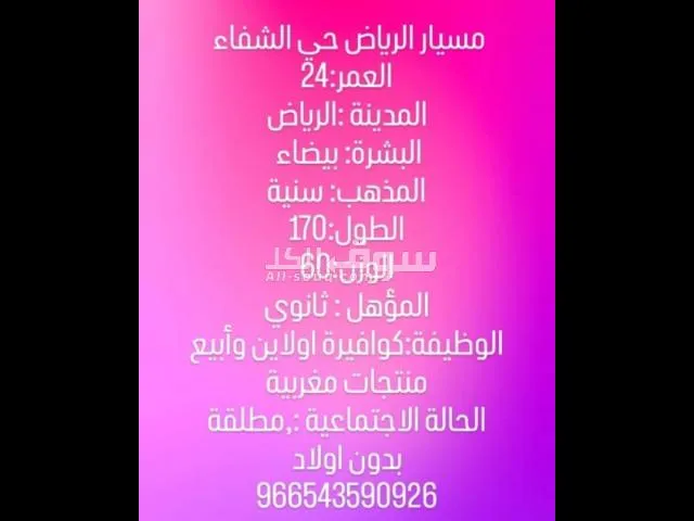 مسيار الرياض حي الشفاء العمر:24 المدينة :الرياض البشرة: بيضاء المذهب: سنية الطول:170 الوزن:60 المؤهل : ثانوي الوظيفة:كوافيرة اولاين وأبيع منتجات مغربية الحالة الاجتماعية :,مطلقة بدون اولاد 966543590926