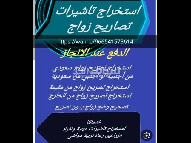 يوجد لدينا تصريح زواج مواطن من اجنبيه من الخارج لدينا تصريح زواج مفتوح يوجد لدينا موافقه زواج بنت مقيمه،يوجد لدينا موافقه زواج أجنبي بنت مواطنه ، يوجد لدينا تاشيرات مكتب العمل تخليص معاملات التجنيس 1*تجنيس زوج مواطنه 2*تجنيس زوجه مواطن3*تجنيس اولاد مواطن ،4*تجنيس اولاد مواطنه) الغاء بلاغ الهروب والتغيب ،تاشيرات فرديه ' عامل منزلي' طباخ'رعاه'تربيه مواشي'مزارعيين 'نحالين 'زياره عائليه 'استقدام عوا...