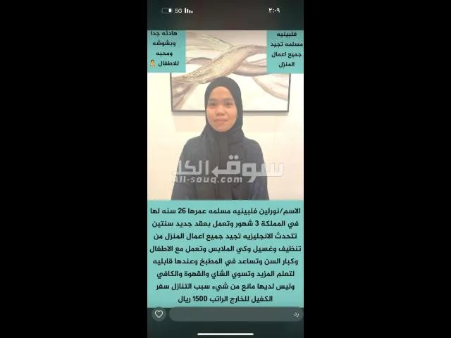 السلام عليكم ورحمه الله وبركاته ⚡⚡كل عام وانتم بخير جميعاً ⭐⭐⭐⭐⭐...كل ست بيت تبحث عن اختيار عامله تتسم بالامانه نوفرها لكم لكي تكوني مطمئنه على بيتك????. والتعامل مع افراد عائلتك حرصا على شعورك بالامان لدينا عاملات منزليه مثاليه????. تتمتع بمهاره وكفاءه عاليه???? للتواصل خاص ????