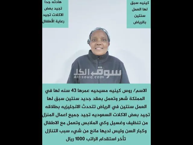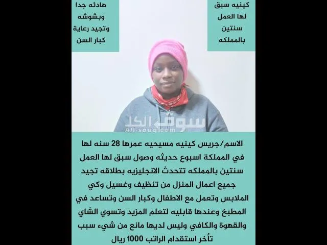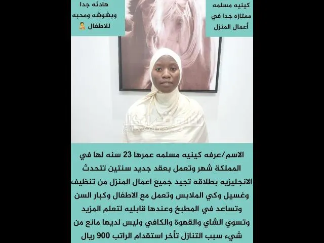 حياكم الله جميعا متوفر لدينا عامله منزليه كينيه تجيد جميع اعمال المنزل وتساعد فى المطبخ الاسم ????????عرفه السن????????23 سنه الديانة ????????مسلمة ال******ية????❤️ كينيه الراتب ????????900 سبب التنازل???????? تأخر استقدام الراتب لها شهربالمملكة ????????تشتغل سنتين جدد تجيد أعمال المنزل ????????من ترتيب تنظيف وكنس وتربى الأطفال للتواصل معنا خاص او واتساب????...