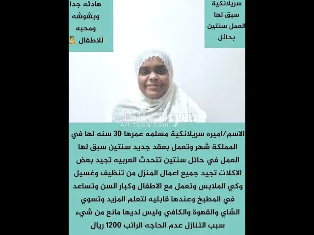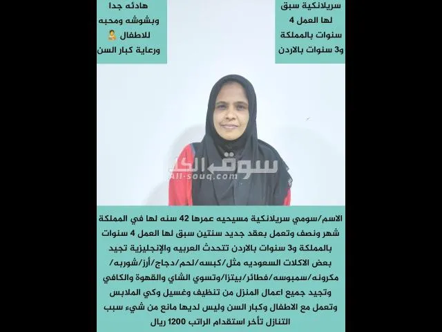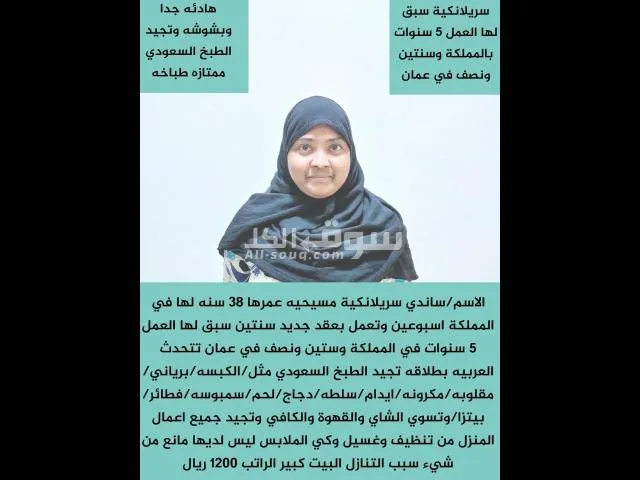 ????????يعلن ابو جودى???????? سريلانكيه طباخه ماهره مدربه على جميع اعمال المنزل 42سنه ميسحيه تجيد العربيه بطلاقه الراتب 1200 لها شهرين في السعوديه سبق لها العمل السعوديه اربع سنوات و3سنوات فى الاردن تجد جميع انواع الطبخ السعودي هاديه مطيعه نشيطه جدا سبب التنازل العمل اكتر من بيت تقبل كل شيء يوجد تجربه اسبوع قبل نقل الكفاله لسنه الوحيدون لكن الافضل بعون الله ...