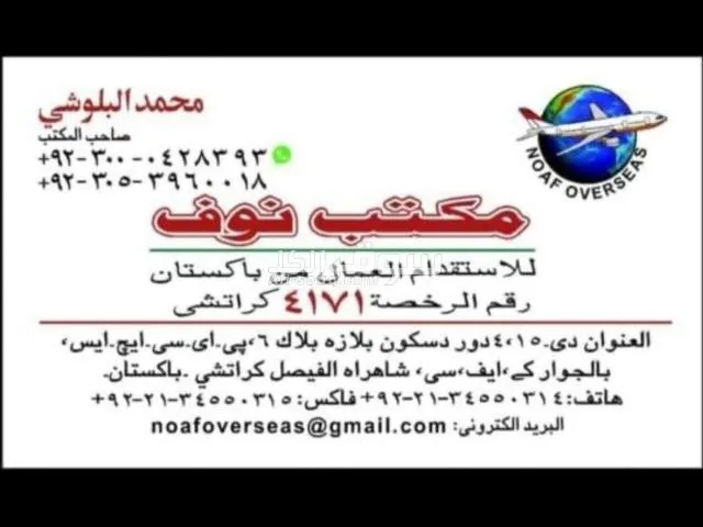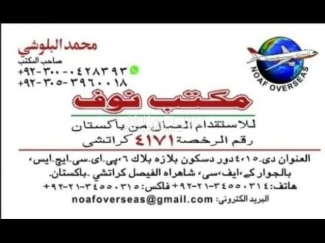 يسرنا تقديم عرضنا المميز لتوفير العمالة من دولة با****تان نحن بعون الله نقوم بتخليص جميع الاجراءات المطلوبه