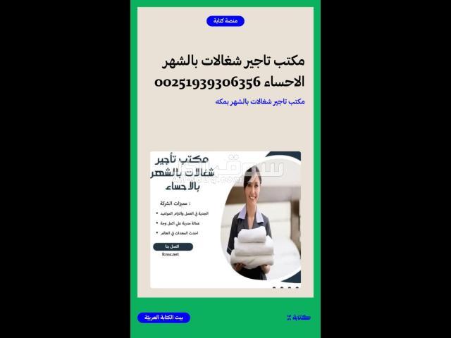 مكتب تاجيرشغالات في مكه مكتب تأجير الشغالات بالشهر في مكة المكرمة برقم 0594650326 يقدم خصم 50%، مكتب شغلات بالشهر مكه مكتب شغلات بالشهر بجدة مكتب شغلات بالشهر في الاحساء