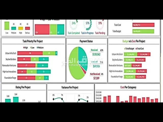 - المشاريع والأعمال: حالة المشروع - التكلفة - نسب الإنجاز - قياس الاداء - تقييم المراحل