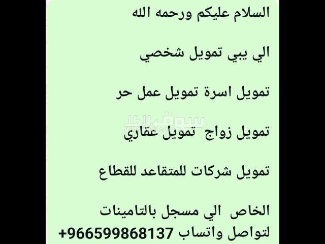 السلام عليكم ورحمه الله الي يبي تمويل شخصي تمويل اسرة تمويل عمل حر تمويل زواج تمويل عقاري تمويل شركات للمتقاعد للقطاع الخاص الي مسجل بالتامينات