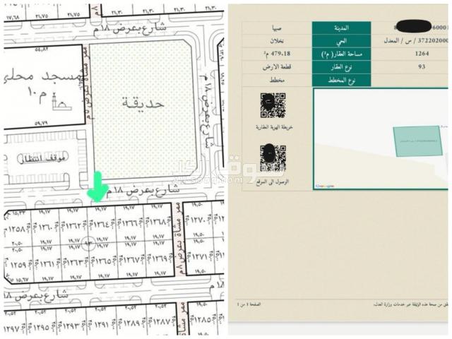 موقع مميز جدا بجوار حديقة ومسجد وقريبه للبيع ارض في صبياء مخطط نخلان بصبيا مساحه 479.18 متر شارع 18م٢ واجهة جنوبيه قطعه رقم 1264 بلوك رقم 93 المطلوب 241000 صافي بدون سعي وضريبه عقد وساطه رقم 71207269
